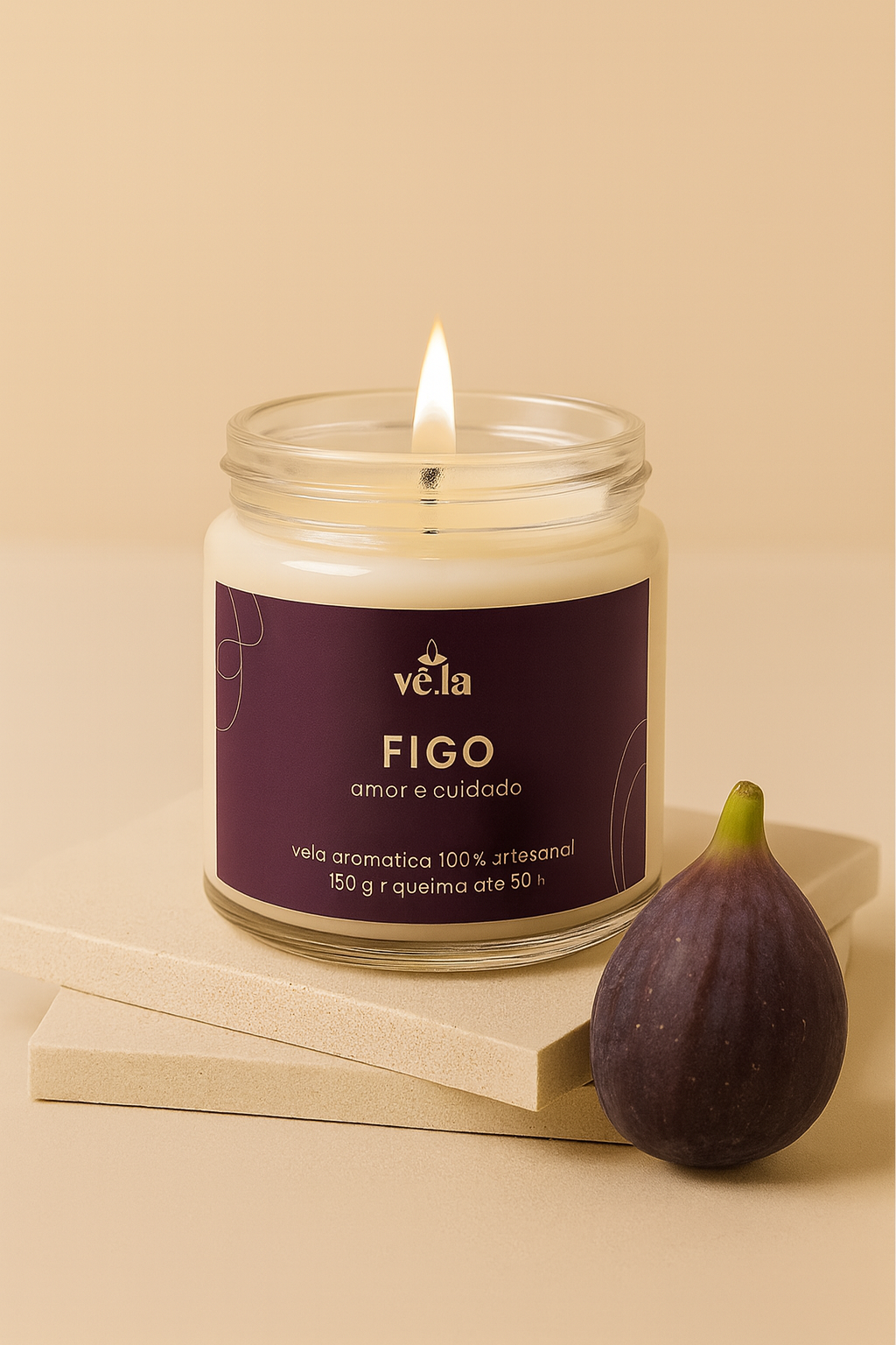 Vela Aromática de Figo - amor e cuidado - 100% artesanal - cera vegetal. Peso líq. 150g queima até 30 horas.